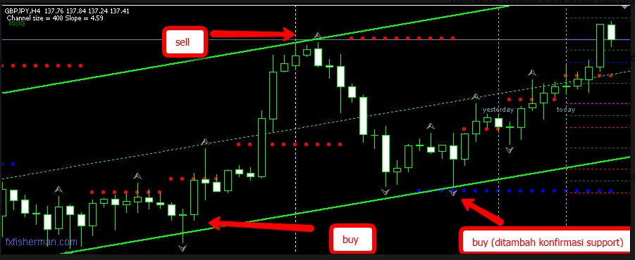 Pasangan mata uang di foto adalah Yen Jepang ke Yen Jepang, dengan jangka waktu 4 hari. Pada gambar tersebut dapat kita lihat dimana harga pasangan mata uang tersebut naik ketika menyentuh garis lower channel, dan dimana harga dari pasangan mata uang tersebut turun saat menyentuh garis upper channel.